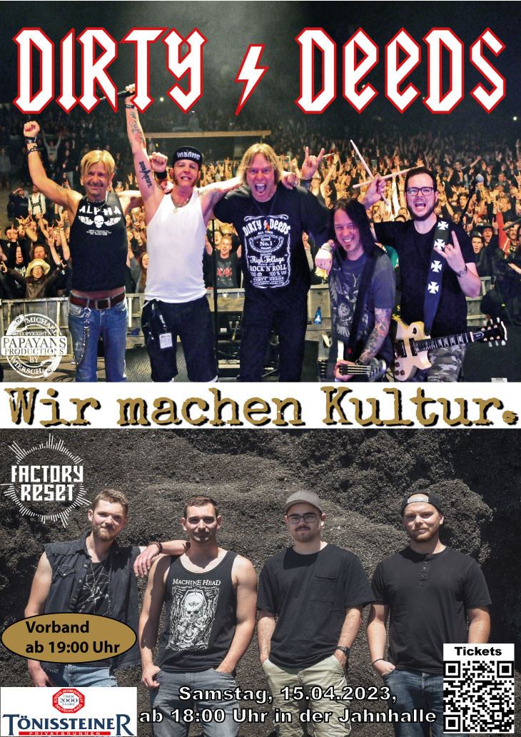 Die Bandmitglieder stammen aus Sinzig und Bad Breisig. In der Umgebung haben sie schon einige erfolgreiche Konzerte gegeben. “Factory Reset“ nennt sich die vierköpfige Hardrock-Band. Zum Repertoire zählen englische und deutschsprachige moderne Songs, sowie Klassiker, alle untermauert von kräftigen Gitarrenriffs. Immer öfter werden auch Eigenkompositionen gespielt.