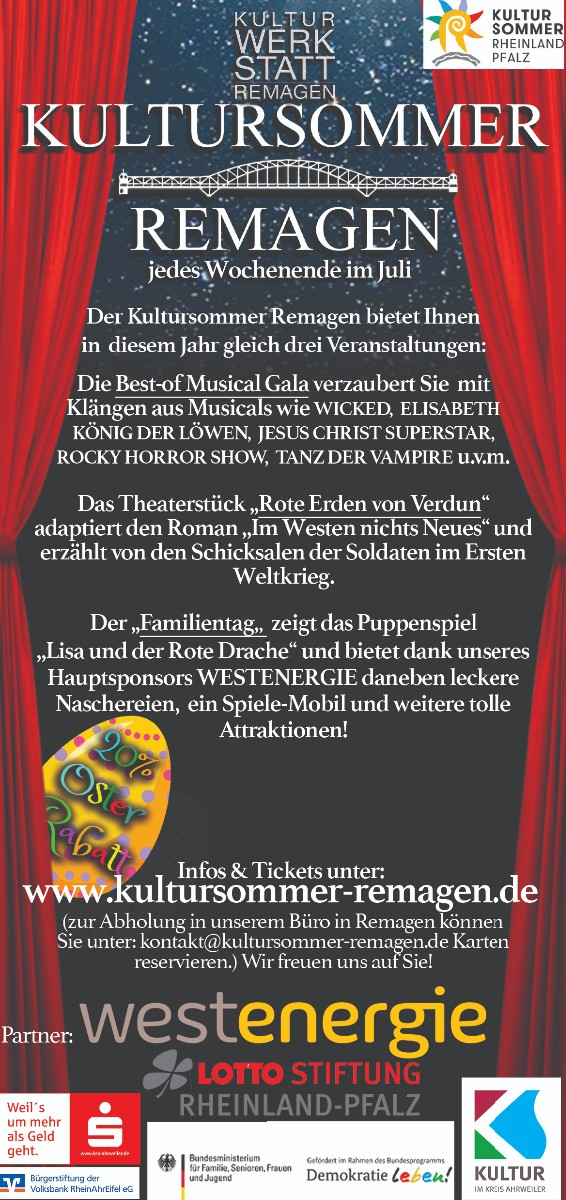 Es ist soweit. Zum ersten Mal öffnet der Kultursommer Remagen seinen Vorhang und bietet Ihnen die Möglichkeit, den bezaubernden Stimmen unseres eigenen Musical-Ensembles zu lauschen. Von DIRTY DANCING, über JESUS CHRIST SUPERSTAR, der TANZ DER VAMPIRE, TARZAN, dem KÖNIG DER LÖWEN, WICKED, STARLIGHT EXPRESS, bis hin zu ELISABETH, RENT, HAIR und MAMMA MIA ist alles dabei, was das Musical Herz höher schlagen lässt. Unser Musical Ensemble entführt Sie mit Schauspiel, Tanz und Gesang in die Welt der Musikals. Wir freuen uns auf Sie!