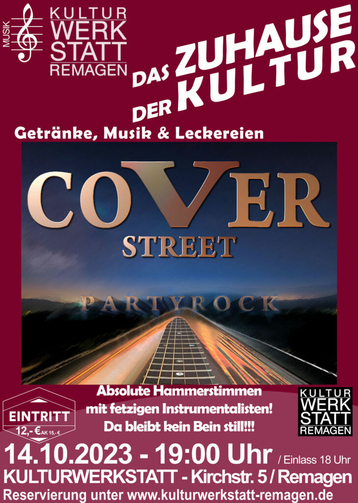 Da kommt Partystimmung auf: „Coverstreet“ ist nach zweijähriger Corona-be-dingter Pause und Umbesetzung wieder unterwegs. Die Band, die schon mehr-fach u.a. die Besucher in Remagen und Umgebung begeistert hat, gastiert wie-der in in der Kulturwerkstatt Remagen.