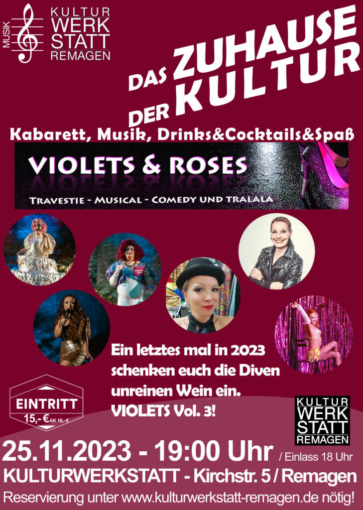 Sie haben sich in die Herzen der Menschen in der Region gespielt: die Künstler-Truppe „Violets and Roses“ um den Sinziger Christian Schuldt. Am Samstag werden sie zum kulturellen Saisonauftakt in Remagen ihre umwerfende Show in der „Kulturwerkstatt“ zum Besten geben. Den Künstlern ist der Spaß an ihrer Sache deutlich anzumerken, das ist ihr Erfolgsrezept. Wenn auch die Naht am „Kleidchen“ von „Christina Sentiaca“ schon mal platzen kann, oder der Reißverschluss, das Zusammenspiel mit „Adelheid von Seidennaht“ wird erneut das Publikum zum Lachen bringen. Gags aus dem eff, eff sind programmiert. Das „Phantom der Oper“ könnte dann auch erneut über die Bühne schweben. Die zierliche „Helena Marina“ wird mit südamerikanischem Tanz und mexikanischem Gesang dabei sein. Mit Sicherheit wird das Publikum aber staunen, über den Fundus der Travestiekünstler. „Christinas“ weit ausladende „Hochzeitsrobe“ soll ja schon Nachahmerinnen gefunden haben, die „Sahnetorte“ läuft mittlerweile bei mancher Geburtstagsfeier auf. Und „Tina Turner“ wird mit Sicherheit am Samstag auch wieder dabei sein.