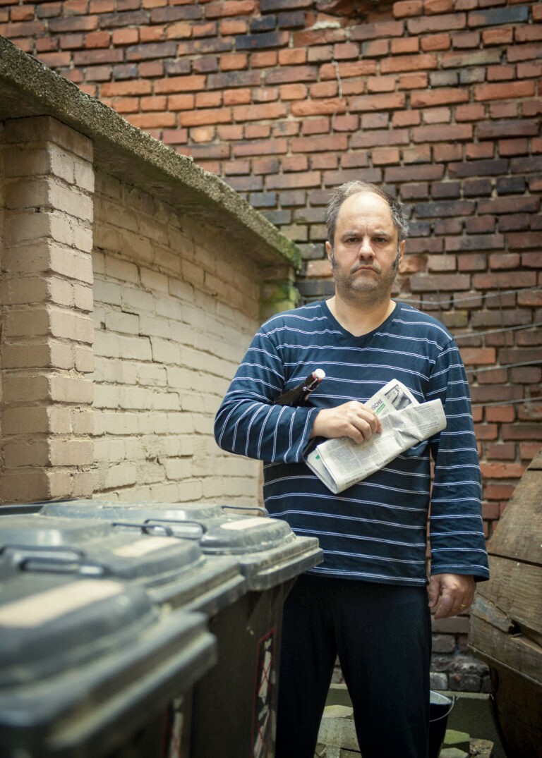 Gehen sie durch die große Eingangstür des Mietshauses, dann geradeaus weiter durch das Tor. Jetzt stehen sie im Hinterhof, links neben ihnen die Abfalleimer, die riechen mal weniger, mal mehr. Schreiten sie am besten zügig weiter, rechts herum, vorbei an der alten Kastanie, die ihre Äste in das bisschen Himmel reckt. Gleich dahinter befindet sich der Eingang zum Hinterhaus. Über ein schmales Treppenhaus kommen Sie in den zweiten Stock hinauf. Vor Ihnen befindet sich nun die rote Eingangsstür. Dahinter haust der Egers mit der Frau. Treten Sie ein! Hinten in der Wohnung, da liegt er im Bett und träumt seine lustigen Nachrichten. Im Wohnzimmersessel sitze er und schüttelt den Kopf deswegen. Kommen Sie mit in die Küche, da hat er gerade ein Käsebrot gegessen, man kann den Käse noch riechen.